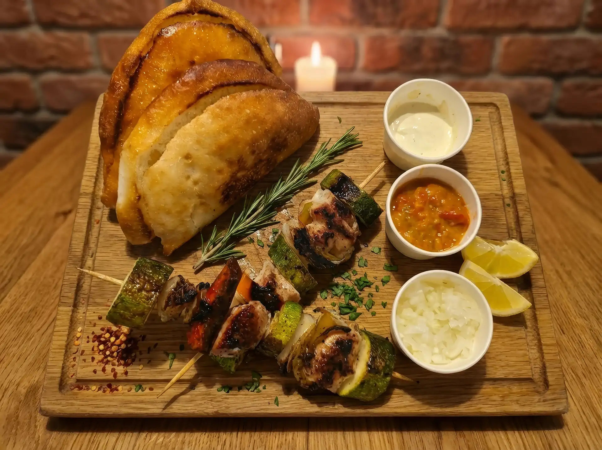 Marinated chicken fillet skewers grilled with seasonal vegetables (onion, pepper, squash — or the best market finds of the day). Served with warm lepinja bread, onions, and smoky ajvar.
