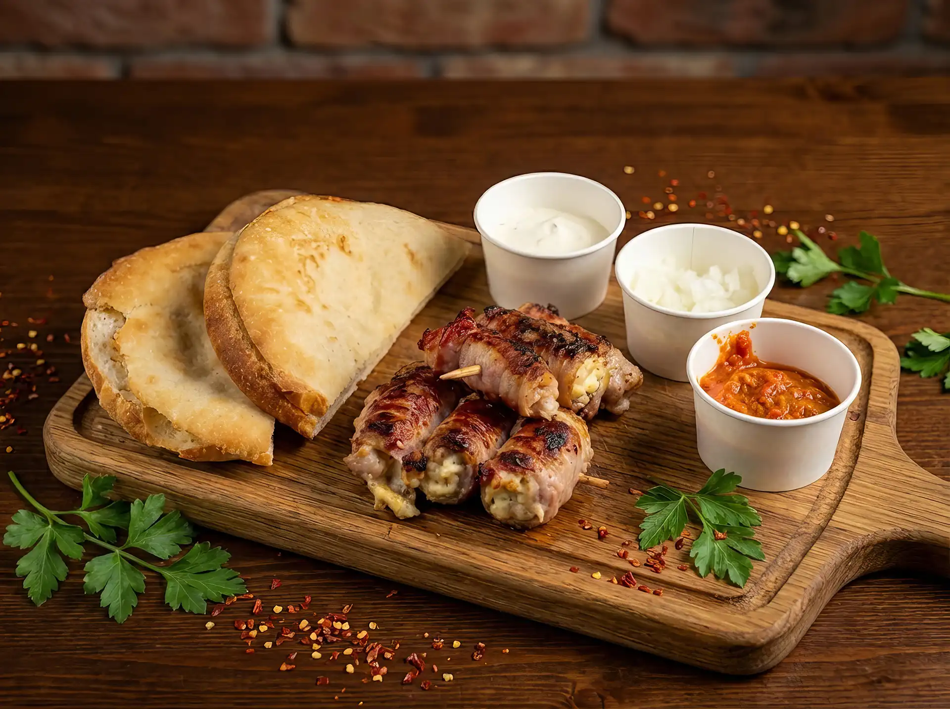 Tender pork loin wrapped with feta cheese and bacon, flame-grilled to perfection. Presented with warm somun bread, sweet onions, and a side of smoky-sweet ajvar.